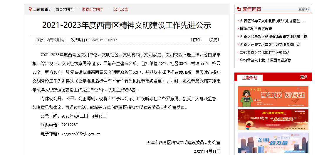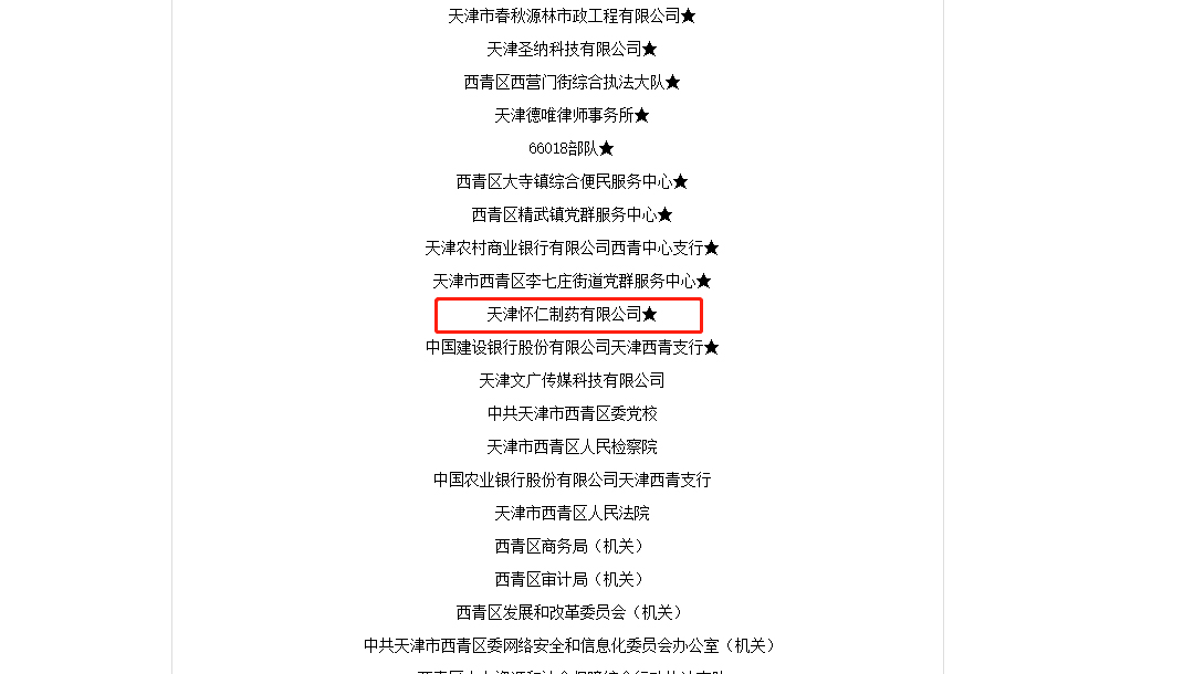 近日,天津市西青區(qū)精神文明建設(shè)委員會(huì)辦公室公示了2021-2023年度天津市西青區(qū)文明單位,天津懷仁制藥有限公司榮獲天津市西青區(qū)“文明單位”稱號(hào)!
